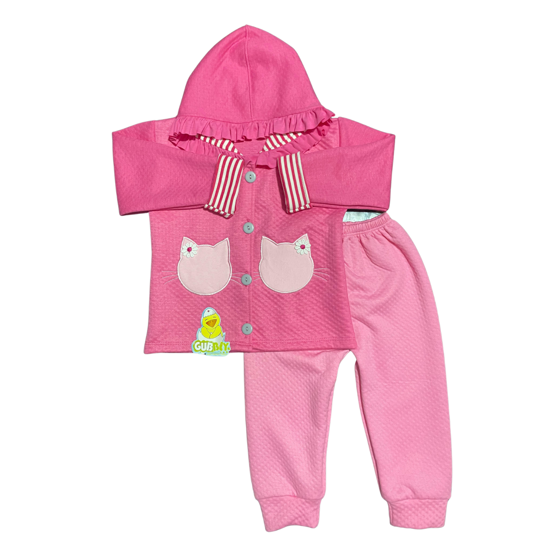 Abrigo con capucha y volantes, acompañado de un pantalón en color gris jaspe. Confeccionado en tela jacquard, abrigadora y suave al tacto. Detalles de bolsillos con forma de gatita y cintas decorativas que realzan su estilo.