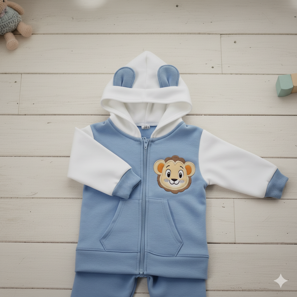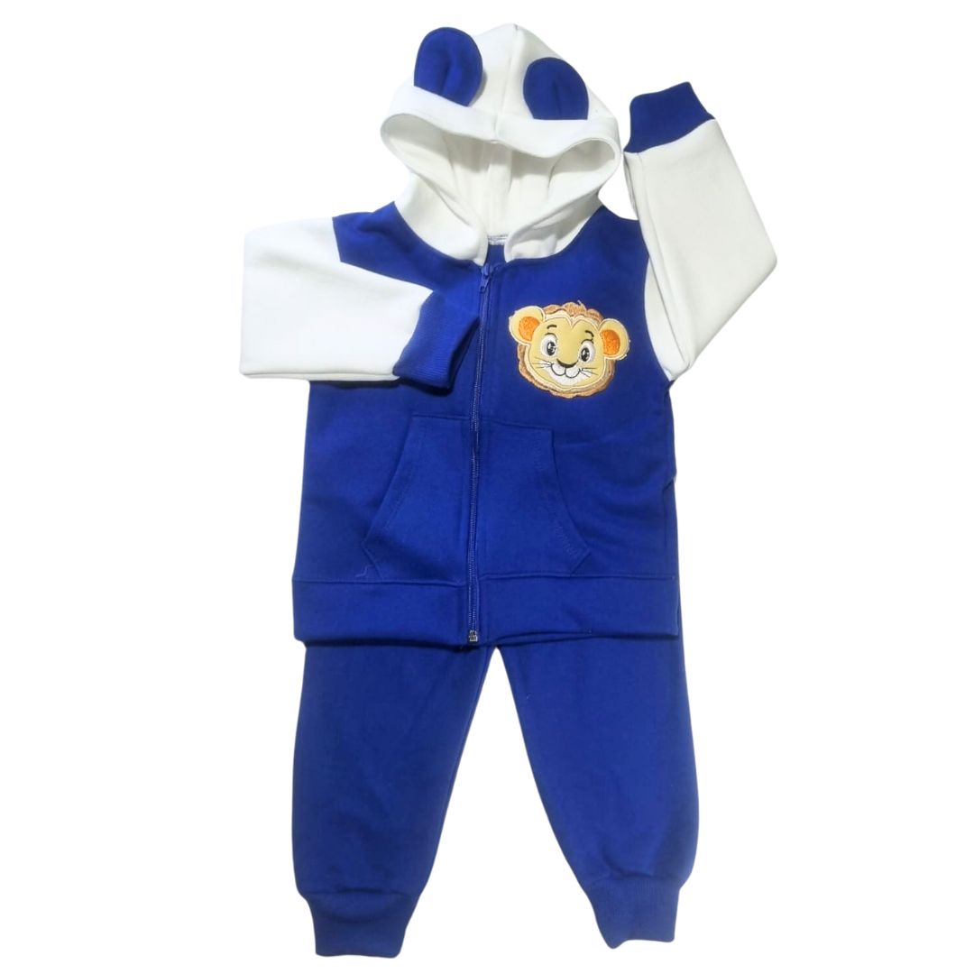Diseño: Conjunto de dos piezas con casaca de cierre, capucha con orejitas decorativas y bordado de leoncito en el pecho, acompañado de pantalón jogger con pretina elástica.