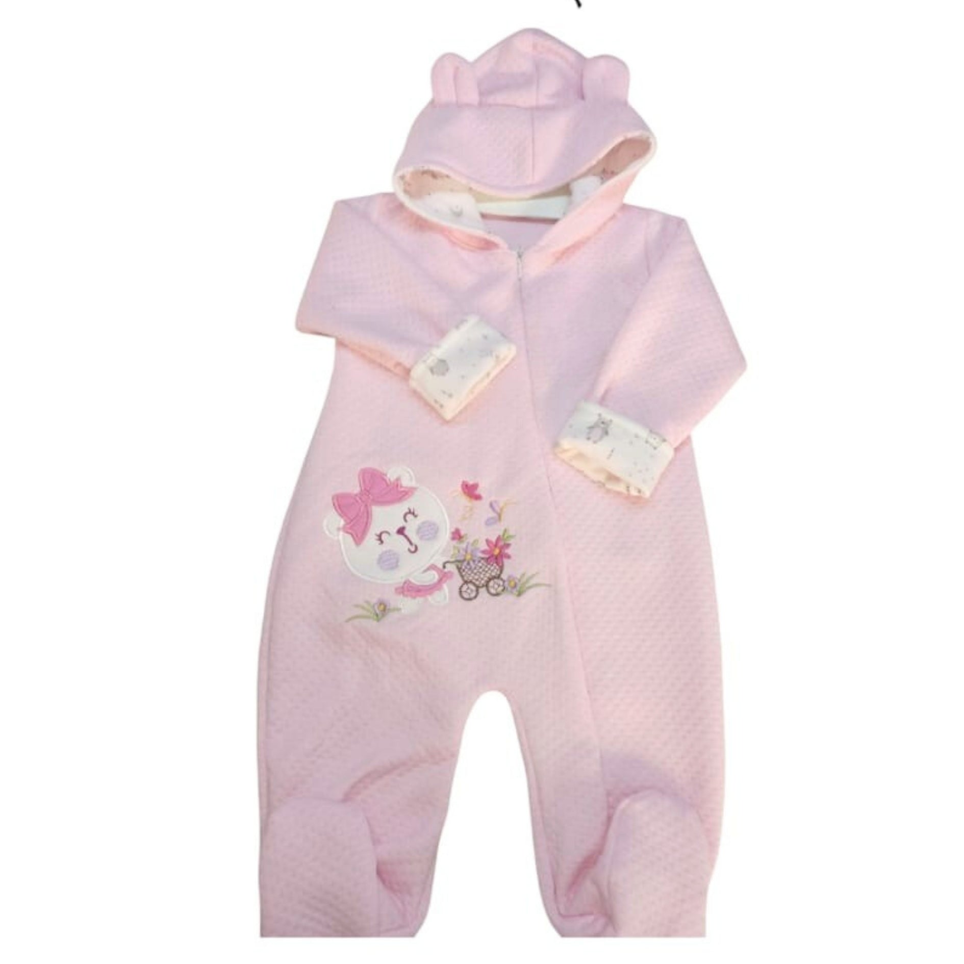 Tierno enterizo con capucha y orejitas, confeccionado en tela jacquard antialérgica, perfecta para mantener al bebé abrigado y cómodo. Su diseño con pies cubiertos y cierre frontal facilita el cambio, brindando practicidad y protección en todo momento.